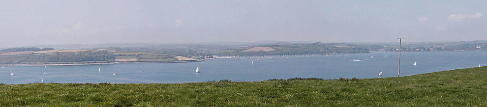 The Carrick Roads can be seen well from the Trelissick Peninsula. From this viewpoint the waters stretch away towards Falmouth. On the left is Camerance Point, a tree-clad promontory. The Feock Peninsula is on the right and beyond that is the creek leading to Mylor village, with the Fal Estuary in the distance behind. Nearby lie the gardens of Trelissick House with their oaks, pines, beeches, rhododendrons, azaleas and camellias.[4]