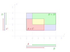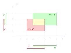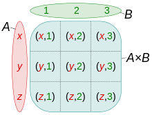 In mathematics, specifically set theory, the Cartesian product of two sets A and B, denoted A × B,[1] is the set of all ordered pairs (a, b) where a is in A and b is in B.[2] In terms of set-builder notation, that is