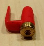The bright-colored Mek-Porek is an inert cartridge base designed to prevent a live round from being unintentionally chambered, to reduce the chances of an accidental discharge from mechanical or operator failure. An L-shaped flag is visible from the outside, so that the shooter and other people concerned are instantly aware about the situation of the weapon. The Mek-Porek is usually tethered to its weapon by a short string, and can be quickly ejected to make way for a live round if the situation suddenly warrants. This safety device is standard-issue in the Israel Defense Forces.[50]