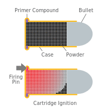 To perform a firing, the cartridge is first inserted into a "ready" position within the chamber aligned with the bore axis (i.e. "in battery"). While in the chamber, the cartridge case obturates all other directions except the bore to the front, reinforced by a breechblock or a locked bolt from behind, designating the forward direction as the path of least resistance. When the trigger is pulled, the sear disengages and releases the hammer/striker, causing the firing pin to impact the primer embedded in the base of the cartridge. The shock-sensitive chemical in the primer then creates a jet of sparks that travel into the case and ignites the main propellant charge within, causing the powders to deflagrate (but not detonate). This rapid exothermic combustion yields a mixture of highly energetic gases and generates a very high pressure inside the case, often fire-forming it against the chamber wall. When the pressure builds up sufficiently to overcome the fastening friction between the projectile (e.g. bullet) and the case neck, the projectile will detach from the case and, pushed by the expanding high-pressure gases behind it, move down the bore and out the muzzle at extremely high speed. After the bullet exits the barrel, the gases are released to the surrounding as ejectae and the chamber pressure drops back down to atmospheric level. The case, which had been elastically expanded by high pressure, contracts slightly, which eases its removal the chamber when pulled by the extractor. The spent cartridge, with its projectile and propellant gone but the case still containing a used primer, then gets ejected from the gun to clear room for a subsequent new round.