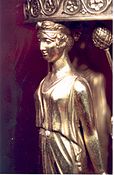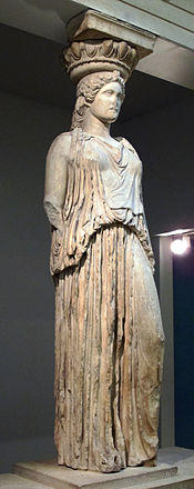 A caryatid (/ˌkæriˈætɪd/ KARR-ee-AT-id; Ancient Greek: Καρυάτις, pl. Καρυάτιδες) is a sculpted female figure serving as an architectural support taking the place of a column or a pillar supporting an entablature on her head. The Greek term karyatides literally means "maidens of Karyai", an ancient town on the Peloponnese. Karyai had a temple dedicated to the goddess Artemis in her aspect of Artemis Karyatis: "As Karyatis she rejoiced in the dances of the nut-tree village of Karyai, those Karyatides, who in their ecstatic round-dance carried on their heads baskets of live reeds, as if they were dancing plants".[1]