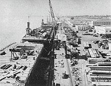 Although Essex-class aircraft carriers were completed in 20 months or less, 1941 projections on the basis of the 38-month average pre-war construction period estimated no new fleet carriers could be expected until 1944.[7] Kaiser had reduced construction time of cargo ships (Liberty ships) from more than a year to less than 90 days, and proposed building a fleet of 50 small carriers in less than two years. The US naval authorities refused to approve construction of the Kaiser-built ships until Kaiser went directly to the President's advisers. The Allies were in desperate need of carriers to replace early war losses. Kaiser produced the small carriers as rapidly as planned and resistance to their value quickly disappeared as they proved their usefulness defending convoys, providing air support for amphibious operations, and allowing fleet carriers to focus on offensive air-strike missions. Unlike most other large warships since HMS Dreadnought, the Casablanca-class ships were equipped with uniflow reciprocating engines instead of steam turbines. This was done because of bottlenecks in the gear-cutting industry, but greatly limited their usefulness after the war.[8]