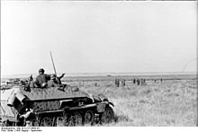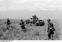 After crossing the Don on 25 July, Army Group A fanned out on a 200 km (120 mi) front from the Sea of Azov to Zymlianskaya (today Zymlyansk).[44] The German Seventeenth Army, along with elements of the Eleventh Army and the Romanian Third Army, manoeuvred west towards the east coast of the Black Sea, while the First Panzer Army attacked to the south-east. The Seventeenth Army made a slow advance but the First Panzer Army had freedom of action. On 29 July the Germans cut the last direct railway between central Russia and the Caucasus, causing considerable panic to Stalin and Stavka, which led to the passing of Order No. 227 "Not a step back!".[45] Salsk was captured on 31 July and Stavropol on 5 August.[30] Although the army group made a quick advance, by 3 August the vanguard comprised only light mobile forces and most of the tanks lagged behind, due to lack of fuel and supply breakdowns, despite the efforts of 4th Air Corps, which flew in supplies around the clock.[43]