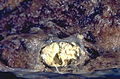 However, in the lung, extensive caseous necrosis with confluent cheesy tan granulomas is typical. The tissue destruction is so extensive that there are areas of cavitation (also known as cystic spaces). See Ghon's complex.