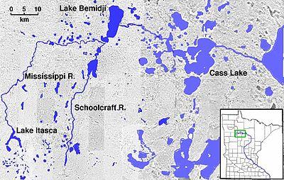 The lake occupies a basin that formed over a ground moraine on the lake's west side and glacial outwash on its east side[2] from melting glacial ice of the Wadena and Des Moines Lobes, respectively,[3] during the retreat of the Laurentide Ice Sheet after the Last Glacial Maximum. The Mississippi River flows through the lake from west to east. A second major stream, the Turtle River, enters the lake from the north. The lake has a large littoral area, particularly around Cedar Island.