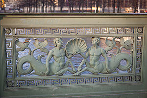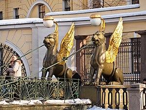 In Saint Petersburg, cast iron was used on the many bridges, sometimes as the supporting structure, but especially for the decorative railings and sculptural embellishments, including the chain-suspension 1826 Bank Bridge, with its distinctive cast iron griffin sculptures and elaborate balustrades, the 1840 Pevchesky Bridge, the 1842 Anichkov Bridge (a copy of the Berlin Castle Bridge), and more seahorses on the 1843-1850 Annunciation Bridge.