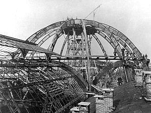 Cast-iron columns for buildings had the advantage of being extremely slender, compared with masonry columns capable of supporting similar weight. That saved space in factories, and so after the five-storey 1795 Ditherington Flax Mill with its internal structure of cast-iron proved the concept, it became ubiquitous in the multi-level mills of northern England, and then further afield in all kinds of industrial and multi-storey structures, up until about 1900. It was also useful in other kinds of buildings, for instance enabling architects of theaters, churches and synagogues to improve sight lines when supporting balconies, by eliminating or at least making the columns that supported the roof or balconies thinner. Cast iron was used in place of timber in some buildings in the early-mid 19th century where smaller supports or larger spans were required (and where wrought iron was too expensive), notably in the Royal Pavilion in Brighton, designed by John Nash and built between 1816-1823, where cast iron columns were used within the walls, as well as cast iron beams, to enable the construction of the decorative domes; the columns in the kitchens were disguised as palm trees.[3] Cast iron was also used as the principle support structure for seaside piers, with multiple slender columns able to support long decks of wrought iron and wood, and later large halls and pavilions; engineer Eugenius Birch built the first, Margate Pier in 1855, followed by at least 14 piers in the 1860s-80s.