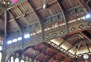 Since it could be used for all the structural members that would be cast in a foundry and then transported to site for erection, it was soon realised it could just as easily be transported anywhere in the world. The Commissioner's House of the Royal Naval Dockyard, Bermuda designed by Edward Holl and built in the 1820s, is considered to be the first residence that used cast iron structure, for the verandahs, and floor and roof framing, and proved the concept of prefabrication and transportation long distances.[7][8] Designers and foundries in the UK and France went on to produced all kinds of prefabricated cast iron structures and items for shipping to their colonies, from decorative elements to structural components to entire buildings. During the Victorian gold rush in Australia in the 1850s hundreds of various types of prefabricated structures were shipped out from England, in timber, cast or wrought iron, or a combination, often with corrugated iron for the walls and roof. They included houses, stores, three complete churches, and a theatre; the most elaborate surviving structure is the completely cast iron Corio Villa, in Geelong.[9] Markets were a type of structure that lent themselves to prefabrication and shipping, such as the structure of the Mercado Centrale in Santiago, Chile, which was shipped out from Glasgow firm Laidlaw & Sons in 1869. The Marché en Fer (Iron Market) in Port au Prince, Haiti, fabricated in Paris, was reputedly intended as a railway station for Cairo in 1891 but was purchased by the Haitian government instead. Watson's Hotel in Mumbai was prefabricated in England and built in 1867-69, using brick infill panels in a heavy and decorative cast-iron frame and is the oldest completely cast iron framed building in the world. Possibly the largest prefabricated cast iron structure is the Bulgarian St. Stephen Church in Istanbul, shipped out from Vienna in the late 1890s.