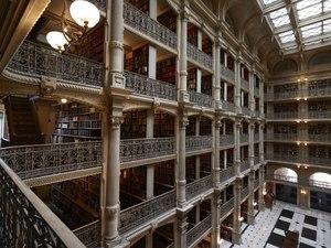 Cast iron was used for the construction of large domes, often incorporating glass, as early as 1811, with the glass dome of the Bourse de commerce in Paris.The central four storey circular hall and towering glass dome[18] of the long-demolished 1849 London Coal Exchange was an early and spectacular use of the material as both structure and architecture. The 1872 George Peabody Library in Baltimore is a similarly elaborate atrium with glass roof, where all the structural members are also decorative and made of cast iron. The lofty glass roof of Milan's Galleria, built 1865-77, is both a dome and glass roofed shopping arcade, the grandest ever built.[19] Later glass roofs such as that of the Grand Palais in Paris employed wrought iron or steel.