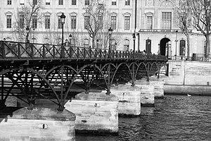 Engineer Thomas Telford improved both the design and quality of the material in bridges, for example, at Buildwas, upstream of Coalbrookdale, built in 1796, and also for aqueducts, such as the world-famous Pontcysyllte Aqueduct in North Wales, built in 1805, where both the arches and the trough are constructed of cast iron. On the continent, the 1804 Pont des Arts in Paris is an early and elegant use of cast iron for a major city river crossing (the metal work of the current bridge is a near identical copy built in 1984 due to structural decay).