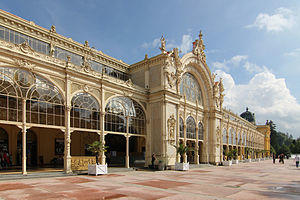 An interesting application is for a winter garden, with a solid roof but extensive glass walls, such as the Spa Colonnade in the spa town of Mariánské Lázně in Czechia, built in 1889, which features an elaborate roof structure and extensive Neo-Baroque decorations in the facade, all in cast iron.