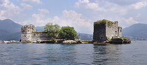 The Castelli di Cannero are three rocky islets of Lake Maggiore in northern Italy. They are located off the shoreline of Cannero Riviera while administratively forming part of the Comune of Cannobio. They are known as castelli, or castles, in recognition of the ruined ancient fortifications which are found on two of them.[1] They are all that remains of the Rocca Vitaliana fortress built between 1519 and 1521 by Ludovico Borromeo, who gave it this name in honour of an illustrious ancestor.
