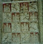 The coat of arms of Castile and León is a stamped shield by open royal crown, barracked in cross. The first and fourth quartering: in the field of gules, a merloned golden castle of three merlons, drafted of sable and rinse of azure. The second and third quartering: in a silver field, a rampant lion of purple, lingued, dyed and armed with gules, crowned with gold.