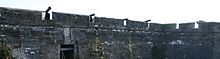 The English laid siege to St. Augustine in November 1702.[15] About 1,500 town residents and soldiers were crammed into the fort during the two-month siege. The small English cannons had little effect on the walls of the fort, because the coquina masonry was very effective at absorbing the impact of cannonballs causing them to sink into the walls, rather than shattering or puncturing them.[16][17] The siege was broken when the Spanish fleet from Havana arrived, trapping some English vessels in the bay.[18] The English were defeated and decided to burn their ships to prevent them from falling under Spanish control, and then marched overland back to Carolina.[19] The town of St. Augustine was destroyed, in part by the Spanish and in part by the English, as a result of the siege.[20]