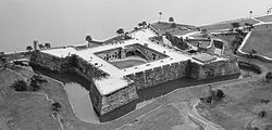 The Castillo de San Marcos (Spanish for "St. Mark's Castle") is the oldest masonry fort in the continental United States; it is located on the western shore of Matanzas Bay in the city of St. Augustine, Florida. The Castillo was designed by the Spanish engineer Ignacio Daza, with construction beginning in 1672, 107 years after the city's founding by Spanish Admiral and conquistador Pedro Menéndez de Avilés, when Florida was part of the Spanish Empire.[1][2][3] The fort's construction was ordered by Governor Francisco de la Guerra y de la Vega after a raid by the English privateer Robert Searles in 1668 that destroyed much of St. Augustine and damaged the existing wooden fort.[4][5] Work proceeded under the administration of Guerra's successor, Manuel de Cendoya in 1671,[6] and the first coquina stones were laid in 1672.[7] The construction of the core of the current fortress was completed in 1695, though it would undergo many alterations and renovations over the centuries.