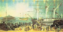 By 1815, West Battery was renamed Castle Clinton, its current official name, in honor of New York City Mayor DeWitt Clinton (who eventually became Governor of New York).[10][3][16] The castle itself was converted to administrative headquarters for the Army. Simultaneously, at the end of the war, there was a public movement to build a park in the Battery area.[16] A 1816 proposal to construct two small office buildings at Castle Clinton was canceled due to public opposition, and the castle lay dormant for three years.[18][16] Even in 1820, it was only being used as a paymaster's quarters and storage area.[19] The United States Army stopped using the fort in 1821, and it was ceded to the city by an act of Congress in March 1822.[19][20][21] By then, the bridge leading to Castle Clinton was frequently used by fishermen who were catching fish from the bridge.[10]