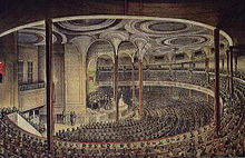 The fort was leased to New York City as a place of public entertainment in June 1824.[20] It opened as Castle Garden on July 3, 1824, a name by which it was popularly known for most of its existence.[20] It served in turn as a promenade, beer garden/restaurant, exhibition hall, opera house, and theater. Designed as an open-air structure, it was eventually roofed over to accommodate these uses.