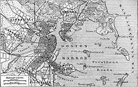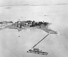 In 1632, a fortification was constructed on Fort Hill to defend the town.[4][5][6] In 1634, Boston sought defenses farther out in the harbor, on one of the numerous islands which protected the port.[7] In July 1634, the town decided to build a fortification on Castle Island.[7][8] Deputy Governor Roger Ludlow and Captain John Mason of Dorchester supervised construction of the fort.[7] After a structure was built on the northeast side of the island, the General Court resolved that the fort at Castle Island should be completed before any other fortification was begun.[4][7] The fort was later known as Castle William and required incoming ships to recognize the fortification and would fire at them if they didn't offer recognition by raising their flag.[9][10] By the end of the century, the fort had been expanded to create a crossfire with the fort on Governor's Island.[10]