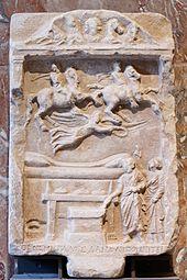 [[File:Stela_funerara_MItra_MNIR.JPG|thumb|Funerary stele from Alba Iulia; it reads Invicto/ Mythrae / Dioscu/ros Marci/ v(otum) s(olvit) l(ibens) m(erito) From the 5th century BCE onwards, the brothers were revered by the Romans, probably as the result of cultural transmission via the Greek colonies of Magna Graecia in southern Italy. An archaic Latin inscription of the 6th or 5th century BCE found at Lavinium, which reads Castorei Podlouqueique qurois ("To Castor and Pollux, the Dioskouroi"), suggests a direct transmission from the Greeks; the word "qurois" is virtually a transliteration of the Greek word κούροις, while "Podlouquei" is effectively a transliteration of the Greek Πολυδεύκης.[33] The construction of the Temple of Castor and Pollux, located in the Roman Forum at the heart of their city, was undertaken to fulfill a vow (votum) made by Aulus Postumius Albus Regillensis in gratitude at the Roman victory in the Battle of Lake Regillus in 495 BCE. The establishment of a temple may also be a form of evocatio, the transferral of a tutelary deity from a defeated town to Rome, where cult would be offered in exchange for favor.[34] According to legend, the twins fought at the head of the Roman army and subsequently brought news of the victory back to Rome.[12] The Locrians of Magna Graecia had attributed their success at a legendary battle on the banks of the Sagras to the intervention of the Twins. The Roman legend could have had its origins in the Locrian account and possibly supplies further evidence of cultural transmission between Rome and Magna Graecia.[35]