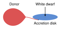 | (Classical) novae | These cataclysmic variables have very large outbursts, of 6 to 19 magnitudes, caused by thermonuclear fusion of material accreted onto the white dwarf. | ||||||