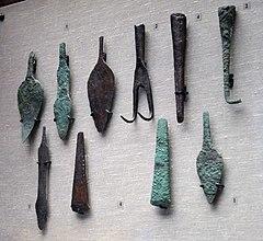 Evidence of early composite bows have been yielded from the Catacomb culture. Quivers with space for ten to twenty arrows have also been found.[26] Its arrowheads may have influenced those of the Sintashta culture.[27]