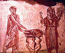 The Catacombs of Rome (Italian: Catacombe di Roma) are ancient catacombs, underground burial places under Rome, Italy, of which there are at least forty, some discovered only in recent decades. Though most famous for Christian burials, either in separate catacombs or mixed together, they began in the 2nd century AD,[1] much as a response to overcrowding and shortage of land. Many scholars have written that catacombs came about to help persecuted Christians to bury their dead secretly. The soft volcanic tuff rock under Rome is highly suitable for tunnelling, as it is softer when first exposed to air, hardening afterwards. Many have kilometres of tunnels, in up to four storeys (or layers).