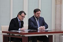 In June 2015 the CiU broke up as a result of disagreement between its constituent parties – Convergència Democràtica de Catalunya (CDC) and Unió Democràtica de Catalunya (UDC) – over the independence process. Mas's CDC joined with the ERC and other groups to form Junts pel Sí (Together for "Yes"), which announced that it would declare independence if it won the election scheduled for September.[46] In the September election, Junts pel Sí and the CUP between them won a majority of seats, but fell short of a majority of votes, with just under 48%.[47] On 9 November 2015, the parliament passed a resolution declaring the start of the independence process, proposed by Junts pel Sí and the CUP.[48] In response, Spanish Prime Minister Mariano Rajoy said that the state would "use any available judicial and political mechanism contained in the constitution and in the laws to defend the sovereignty of the Spanish people and of the general interest of Spain", a hint that he would not stop at military intervention.[49] Following prolonged negotiations between Junts pel Sí and the CUP, Mas was replaced as president by Carles Puigdemont in January 2016. Puigdemont, on taking the oath of office, omitted the oath of loyalty to the king and the Spanish constitution, the first Catalan president to do so.[49]