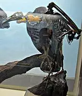 The beak is slightly hooked and is relatively weak compared with those of other birds of prey.[33] This is because it is adapted to tear the weak flesh of partially rotted carrion, rather than fresh meat.[32] The nostrils are oval and are set in a soft cere.[37] The nasal passage is perforate, not divided by a septum, so that when looking from the side, one can see through the beak.[38] The eyes are prominent, and, unlike those of eagles, hawks, and falcons, they are not shaded by a brow bone.[37] Members of Coragyps and Cathartes have a single incomplete row of eyelashes on the upper lid and two rows on the lower lid, while Gymnogyps, Vultur, and Sarcoramphus lack eyelashes altogether.[39]