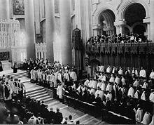 Duke Ellington's Second Sacred Concert, of his original sacred music compositions, premiered at the cathedral on January 19, 1968. No recording of the performance has surfaced to date. After its debut performance, the Second Sacred Concert was recorded on January 22 and February 19, 1968 at Fine Studio, New York City. The concert was originally issued as a double LP on Prestige Records. It was later reissued on a single CD without the original tracks "Don't Get Down On Your Knees To Pray Until You Have Forgiven Everyone" and "Father Forgive".[29] Performing at the recording session were Ellington on the piano and doing the narration, 16 of his orchestra members, four vocalists including the Swedish singer Alice Babs, and five choirs: the AME Mother Zion Church Choir, the choirs Of St Hilda's and St. Hugh's School, the Central Connecticut State College Singers, and the Frank Parker Singers.