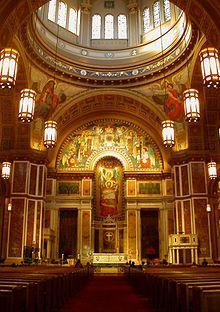 The structure is constructed of red brick with sandstone and terra cotta trim in the Romanesque Revival style with Byzantine elements. Designed by architect C. Grant La Farge, it is in the shape of a Latin cross measuring 155 ft × 136 ft (47 m × 41 m) and seats about 1,200 persons. The interior is richly decorated in marble and semiprecious stones, notably a 35 ft (11 m) mosaic of Matthew behind the main altar by Edwin Blashfield. The cathedral is capped by an octagonal dome that extends 190 ft (58 m) above the nave and is capped by a cupola and crucifix that brings the total height to 200 ft (61 m).[7] Both structural and decorative elements underwent extensive restoration between 2000 and September 21, 2003, the feast day of St. Matthew.