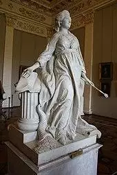 Catherine read three sorts of books, namely those for pleasure, those for information, and those to provide her with a philosophy.[84] In the first category, she read romances and comedies that were popular at the time, many of which were regarded as "inconsequential" by the critics both then and since.[84] She especially liked the work of German comic writers such as Moritz August von Thümmel and Christoph Friedrich Nicolai.[84] In the second category fell the work of Denis Diderot, Jacques Necker, Johann Bernhard Basedow and Georges-Louis Leclerc, Comte de Buffon.[85] Catherine expressed some frustration with the economists she read for what she regarded as their impractical theories, writing in the margin of one of Necker's books that if it was possible to solve all of the state's economic problems in one day, she would have done so a long time ago.[85] For information about particular nations that interested her, she read Jean Baptiste Bourguignon d'Anville's Memoirs de Chine to learn about the vast and wealthy Chinese empire that bordered her empire; François Baron de Tott's Memoires de les Turcs et les Tartares for information about the Ottoman Empire and the Crimean khanate; the books of Frederick the Great praising himself to learn about Frederick just as much as to learn about Prussia; and the pamphlets of Benjamin Franklin denouncing the British Crown to understand the reasons behind the American Revolution.[85] In the third category fell the work of Voltaire, Friedrich Melchior, Baron von Grimm, Ferdinando Galiani, Nicolas Baudeau and Sir William Blackstone.[86] For philosophy, she liked books promoting what has been called "enlightened despotism", which she embraced as her ideal of an autocratic but reformist government that operated according to the rule of law, not the whims of the ruler, hence her interest in Blackstone's legal commentaries.[86]