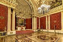 Catherine was crowned at the Assumption Cathedral in Moscow on 22 September 1762.[30] Her coronation marks the creation of one of the main treasures of the Romanov dynasty, the Imperial Crown of Russia, designed by Swiss-French court diamond jeweller Jérémie Pauzié. Inspired by the Byzantine Empire design, the crown was constructed of two half spheres, one gold and one silver, representing the eastern and western Roman empires, divided by a foliate garland and fastened with a low hoop. The crown contains 75 pearls and 4,936 Indian diamonds forming laurel and oak leaves, the symbols of power and strength, and is surmounted by a 398.62-carat ruby spinel that previously belonged to the Empress Elizabeth, and a diamond cross. The crown was produced in a record two months and weighed 2.3 kg.[31] From 1762, the Great Imperial Crown was the coronation crown of all Romanov emperors until the monarchy's abolition in 1917. It is one of the main treasures of the Romanov dynasty and is now on display in the Moscow Kremlin Armoury Museum.[32]