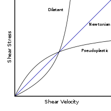 Ketchup is a non-Newtonian fluid, meaning that its viscosity changes under stress and is not constant. It is a shear thinning fluid which means its viscosity decreases with increased shear stress.[43] The equation used to designate a Non-Newtonian fluid is as follows: . This equation represents apparent viscosity where apparent viscosity is the shear stress divided by shear rate. Viscosity is dependent on stress. This is apparent when you shake a bottle of tomato sauce/ketchup so it becomes liquid enough to squirt out. Its viscosity decreased with stress.[44]