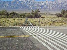 Painted lines on the road can serve as skeuomorphs of cattle grids. The light-dark pattern of lines on pavement resembles a true cattle grid to animals, and by association think they will not be able to cross. Using a virtual cattle grid is initially cheaper than a true cattle grid,[11] but the cost of periodic re-painting may eventually exceed the initial cost of a well-built metal guard.[12] A particular advantage of painted guards is that they are smooth to drive over; in the US, most are found on state or federal highways, rather than private roads.[12]