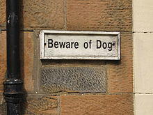 Under English law, placing such a sign does not relieve the owner of responsibility for any harm which may come to people attacked by the dog.[4][5] Where a company employs the services of a guard dog, the Chapter 50 of Guard Dogs Act 1975 requires "a notice containing a warning that a guard dog is present is clearly exhibited at each entrance to the premises."[6] In many cases, security signs integrate both CCTV warnings and Guard Dog warnings into the same signage.[7]