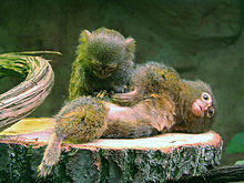 A pygmy marmoset group, ranging from two to nine members, contains one or two adult males and one or two adult females, including a single breeding female and her offspring.[16] Interbirth interval ranges from 149–746 days.[17] In contrast to other callitrichines, there is no relationship between the number of adult males and the number of infants and offspring. However, there is a significant positive relationship between the number of juveniles and the number of adult and sub-adult group members.[18] Young marmosets typically remain in the group for two consecutive birth cycles. The pygmy marmoset uses special types of communication to give alerts and warning to its family members. These include chemical, vocal, and visual types of communication.[19] It is believed to serve to promote group cohesion and avoidance of other family groups.[20]