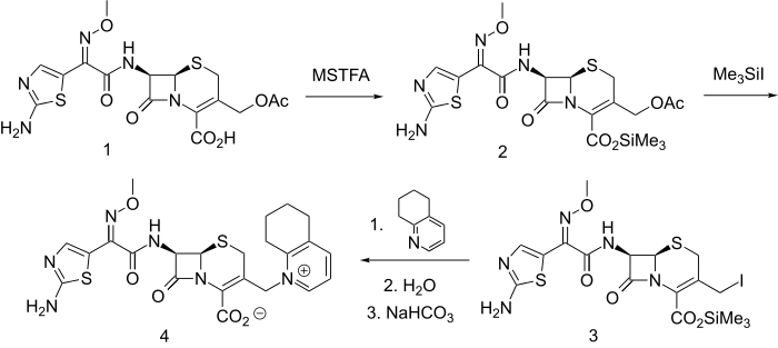 Cefotaxime (1) is a potent cephalosporin antibiotic in its own right. Further modification of this drug by inclusion of a quaternary ammonium cation gives a compound suitable for parenteral administration by increasing water solubility. The acid in cefotaxime is first protected as its silyl ester (2) by derivatization with N-methyl-N-(trimethylsilyl)trifluoroacetamide (MSTFA). Treatment of this intermediate with trimethylsilyl iodide gives the allylic iodide (3). Displacement of halogen with 5,6,7,8-tetrahydroquinoline[6] (2,3-cyclohexenopyridine) gives the corresponding quaternary salt. Hydrolysis of the silyl ester followed by adjustments of the pH leads to the betaine cefquinome (4).