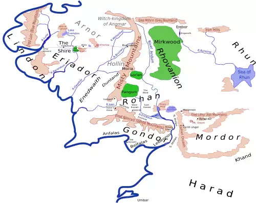 Sketch map of Middle-earth in the Third Age, showing Lindon (left), Lake Evendim (top left), Hollin and Lothlórien (centre), and Belfalas (bottom)