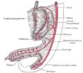 In contrast to the drainage of midgut and hindgut structures by the superior mesenteric vein and inferior mesenteric vein respectively, venous return from the coeliac artery is through either the splenic vein emptying into the hepatic portal vein or via smaller tributaries of the portal venous system.