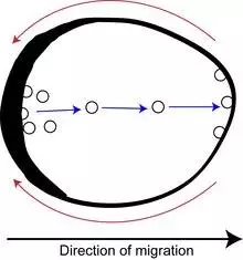 Adhesive crawling is not the only migration mode exhibited by eukaryotic cells. Importantly, metastatic cancer cells and immune cells like macrophages and neutrophils have been found to be capable of adhesion-independent migration. The mechanistic basis of this migration mode is less understood than either eukaryotic cell crawling or flagella-based swimming by microorganisms. The physicist E. M. Purcell theorized that under conditions of low Reynolds number fluid dynamics, which apply at the cellular scale, rearward surface flow could provide a mechanism for microscopic objects to swim forward.[19] After some decades, experimental support for this model was provided using optogenetics. It was shown that cells migrating in an amoeboid fashion without adhesions exhibit plasma membrane flow towards the cell rear that can propel cells by exerting tangential forces on the surrounding fluid.[18][20] Polarized trafficking of membrane-containing vesicles from the rear to the front of the cell helps maintain cell size.[18] Rearward membrane flow was also observed in Dictyostelium discoideum cells.[21] Interestingly, the migration of supracellular clusters has also been found to be supported by a similar mechanism of rearward surface flow.[22]