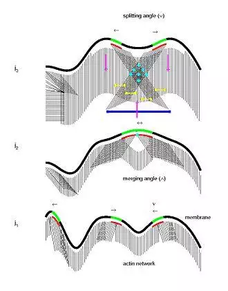 Based on some mathematical models, recent studies hypothesize a novel biological model for collective biomechanical and molecular mechanism of cell motion.[23] It is proposed that microdomains weave the texture of cytoskeleton and their interactions mark the location for formation of new adhesion sites. According to this model, microdomain signaling dynamics organizes cytoskeleton and its interaction with substratum. As microdomains trigger and maintain active polymerization of actin filaments, their propagation and zigzagging motion on the membrane generate a highly interlinked network of curved or linear filaments oriented at a wide spectrum of angles to the cell boundary. It is also proposed that microdomain interaction marks the formation of new focal adhesion sites at the cell periphery. Myosin interaction with the actin network then generate membrane retraction/ruffling, retrograde flow, and contractile forces for forward motion. Finally, continuous application of stress on the old focal adhesion sites could result in the calcium-induced calpain activation, and consequently the detachment of focal adhesions which completes the cycle.