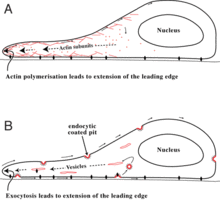 Studies have also shown that the front of the migration is the site at which the membrane is returned to the cell surface from internal membrane pools at the end of the endocytic cycle.[16] This has led to the hypothesis that extension of the leading edge occurs primarily by addition of membrane at the front of the cell. If so, the actin filaments that form at the front might stabilize the added membrane so that a structured extension, or lamella, is formed rather than a bubble-like structure (or bleb) at its front.[17] For a cell to move, it is necessary to bring a fresh supply of "feet" (proteins called integrins, which attach a cell to the surface on which it is crawling) to the front. It is likely that these feet are endocytosed toward the rear of the cell and brought to the cell's front by exocytosis, to be reused to form new attachments to the substrate.