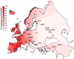 More recent genetic evidence does not support the notion of a significant genetic link between these populations, beyond the fact that they are all West Eurasians. Sardinian-like Neolithic farmers did populate Britain (and all of Northern Europe) during the Neolithic period, however, recent genetics research has claimed that, between 2400BC and 2000BC, over 90% of British DNA was overturned by a North European population of ultimate Russian Steppe origin as part of an ongoing migration process that brought large amounts of Steppe DNA (including the R1b haplogroup) to North and West Europe.[52] Modern autosomal genetic clustering is testament to this fact, as both modern and Iron Age British and Irish samples cluster genetically very closely with other North European populations, and somewhat limited with Galicians, Basques or those from the south of France.[53][54] Such findings have largely put to rest the theory that there is a significant ancestral genetic link (beyond being Europeans) between the various 'Celtic' peoples in the Atlantic area, instead, they are related in that male lines are brother R1b L151 subclades with the local native maternal line admixture explaining the genetic distance noted.