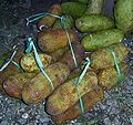 The fruit is normally consumed in the areas where it is cultivated and can be eaten fresh or cooked. The large fruit are often cut open and sliced into pieces for sale. The seeds can be fried, boiled or grilled, then peeled and eaten with salt. The taste of the seeds is similar to water chestnuts. The young fruit, like young jackfruit, can be used as a vegetable.[3] As a vegetable, the young fruit is peeled, sliced and boiled, then sometimes seasoned or added as an ingredient to other foods, such as curries.[2] In Borneo, the skin of the cempedak can be processed into food called mandai made by peeling the fruit until it looks white, then soaking it in brine to preserve and soften the texture. Mandai is usually consumed after frying.[3]