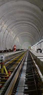During 2017 the installation of the track, electrical supply cables, telecommunications and radio systems, automation systems, overhead lines, and various safety and control systems commenced.[6] During August 2017, the first sections of ballastless track were laid in the northern end of the eastern bore.[20] On 30 May 2018, the final railroad tie was laid, meaning that trains can now travel the entire length of the tunnel.[21]
