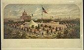 The Great Central Fair on Logan Square in Philadelphia, Pennsylvania, in 1864 (also known as the Great Sanitary Fair), was one of the many sanitary fairs held during the Civil War. They provided a creative and communal means for ordinary citizens to promote the welfare of Union soldiers and dedicate themselves to the survival of the nation, and the Great Central Fair bolstered Philadelphia's role as a vital center in the Union war effort. It anticipated the combination of public, private, and commercial investments that were necessary to mount the Centennial Exposition. Both had a similar neo-Gothic appearance, the waving flags, the huge central hall, the "curiosities" and relics, handmade and industrial exhibits, and also a visit from the president and his family.