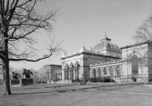 The Art Gallery building (now known as Memorial Hall) is the only large exhibit building still standing on the exposition site. Constructed of brick, glass, iron, and granite in the beaux-arts style, it was the largest art hall in the country when it opened, with a massive 1.5-acre footprint and a 150-foot dome atop a 59-foot-high structure. The central domed area is surrounded by four pavilions on the corners, with open arcades to the east and west of the main entrance. It provided 75,000 square feet of wall surface for paintings and 20,000 square feet of floor space for sculptures. The exposition received so many art contributions that a separate annex was built to house them all. Another structure was built for the display of photography.[22] Memorial Hall was designed by Herman J. Schwarzmann, who basically adopted an art museum plan submitted by Nicholas Félix Escalier to the Prix de Rome competition in 1867–69. Memorial Hall became the prototype, both from a stylistic and organizational standpoint, for other museums such as the Art Institute of Chicago (1892–1893), the Milwaukee Public Museum (1893–1897), the Brooklyn Museum (1893–1924), and the Detroit Institute of Art (1920–1927). Libraries such as the Library of Congress, the New York Public Library, and the Free Library of Philadelphia also emulated its form. Finally, Memorial Hall was the architectural inspiration for the German capitol, the Reichstag building in Berlin.[23]