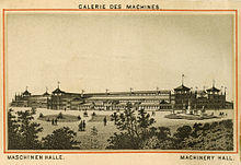 Designed by Joseph M. Wilson and Henry Pettit, Machinery Hall was the second largest structure in the exposition and located west of the Main Exhibition Building. With a superstructure made of wood and glass resting on a foundation of massive masonry, it had a main hall painted light blue, 1,402 ft long and 360 ft wide, with a wing of 208 ft by 210 ft attached on the south side of the building. The length of the building was 18 times its height. With eight entrances, it occupied 558,440 square feet, had 1,900 exhibitors, and took six months to construct. The exhibits focused on machines and evolving industries.[21] Machinery Hall was the show case for the state of the art industrial technology that was being produced at the time. The United States of America alone took up two-thirds of the exhibit space in the building.