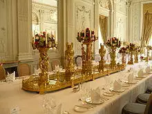 On the table, a centrepiece is a central object which serves a decorative purpose.[2] However, centrepieces are often not too large, to avoid difficulty with visibility around the table and to allow for the easier serving of dishes.