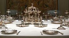 Traditional types for the very formal dining table include the epergne, with branching arms ending in bowls, and the surtout de table, in English reserved for a long tray, often with mirrors as the surface, on which candles, sculptures and other objects are placed.